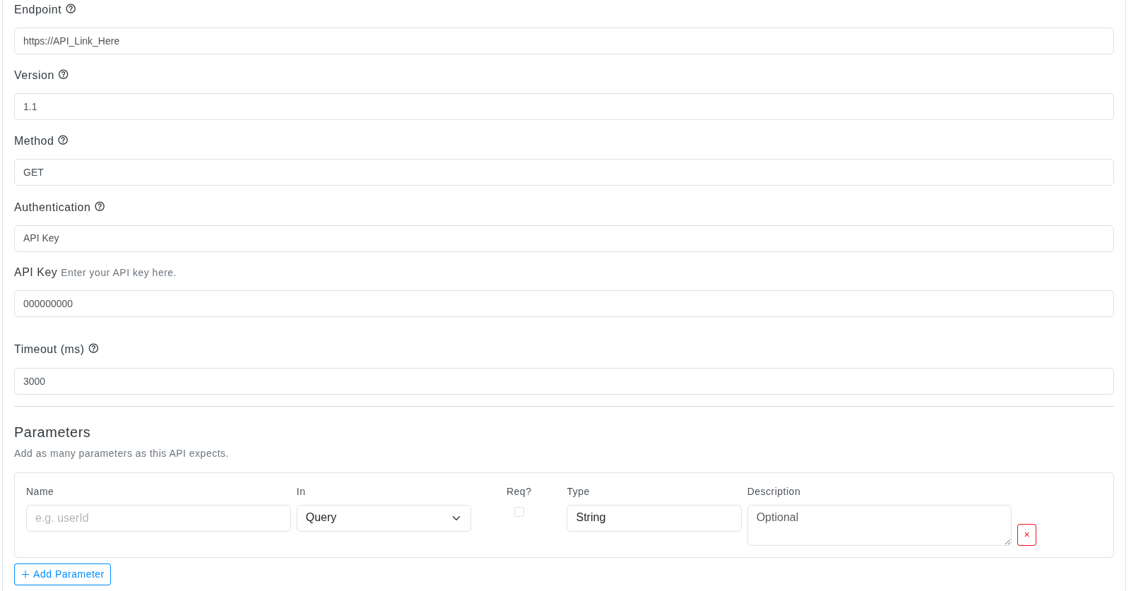 Fill in endpoint, HTTP method, authentication type, and timeout.